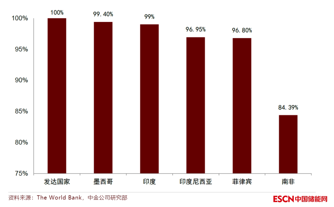 其他發(fā)展中國家風(fēng)光裝機(jī)增長及電網(wǎng)基礎(chǔ)設(shè)施薄弱驅(qū)動(dòng)儲能裝機(jī)需求。2021年以來,巴西、印度、智利等國家均通過政策手段驅(qū)動(dòng)表前及表后儲能裝機(jī)。此外,如南非等部分發(fā)展中國家電力基礎(chǔ)設(shè)施相對薄弱、電網(wǎng)覆蓋率低、停電次數(shù)多,將帶來部分保障供電系統(tǒng)穩(wěn)定性與離網(wǎng)式儲能需求。