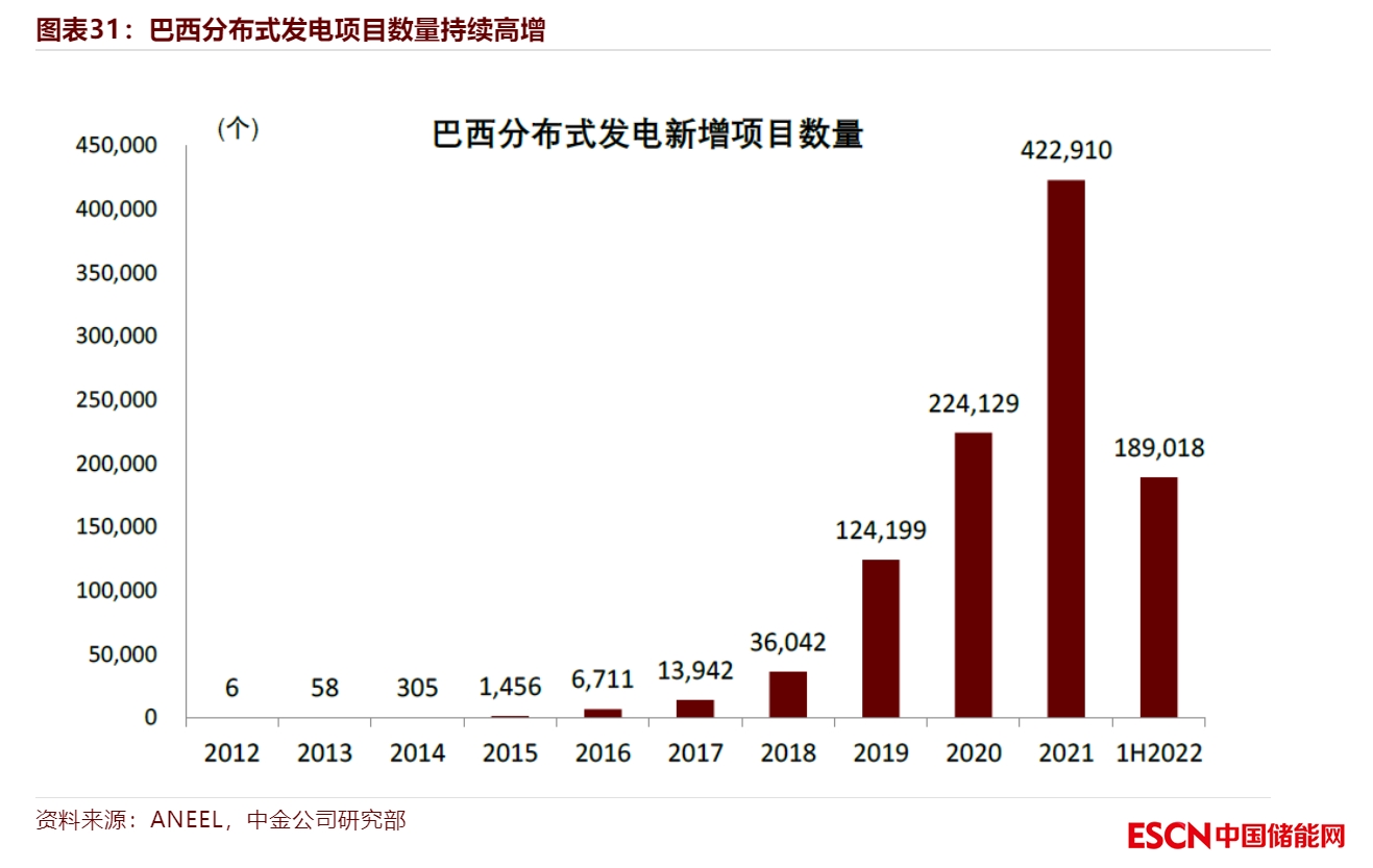 以巴西為例,過去十年間政策驅(qū)動(dòng)分布式光伏裝機(jī)高增,電網(wǎng)基礎(chǔ)設(shè)施薄弱逐步成制約因素。在持續(xù)的“凈計(jì)量”政策刺激之下,巴西分布式光伏項(xiàng)目數(shù)量持續(xù)高增,2021年新增項(xiàng)目數(shù)量已突破42萬個(gè)。而另一方面,持續(xù)增長的風(fēng)光裝機(jī)對巴西原本并不發(fā)達(dá)的電力系統(tǒng)帶來巨大挑戰(zhàn),政府需通過改善電網(wǎng)基礎(chǔ)設(shè)施或增強(qiáng)靈活性資源等方式適應(yīng)波動(dòng)性可再生能源的大規(guī)模接入問題。
