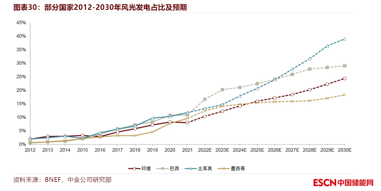 巴西、菲律賓、泰國等發(fā)展中國家通過目標(biāo)規(guī)劃、補(bǔ)貼政策等方式驅(qū)動(dòng)風(fēng)光裝機(jī)。預(yù)期眾多發(fā)展中國家風(fēng)光裝機(jī)及發(fā)電量占比快速提升。2021年巴西、土耳其、墨西哥和印度風(fēng)光發(fā)電量分別占總發(fā)電量的10.91%、11.78%、9.62%和8.04%,BNEF預(yù)期在2030年,其風(fēng)光發(fā)電量占比將分別提升至29.05%、39.02%、18.33%和24.36%。