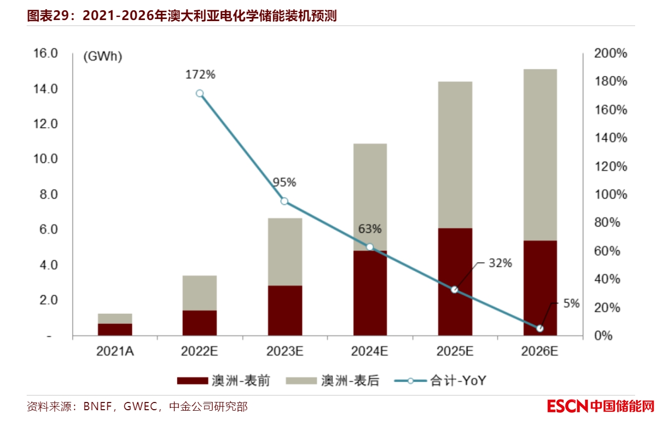 短期看,我們預(yù)計(jì)2023年澳大利亞電力系統(tǒng)中新增電化學(xué)儲能裝機(jī)達(dá)7GWh,其中表前/表后市場分別為3/4GWh。展望未來,我們認(rèn)為澳大利亞市場分布式光伏裝機(jī)規(guī)模較大、FiT退坡后持續(xù)驅(qū)動(dòng)表后儲能裝機(jī),表前市場主要受益于東南部電網(wǎng)靈活性資源缺乏,預(yù)計(jì)2026年澳大利亞新增電化學(xué)儲能裝機(jī)15GWh,其中表前/表后分別為5/10GWh。
