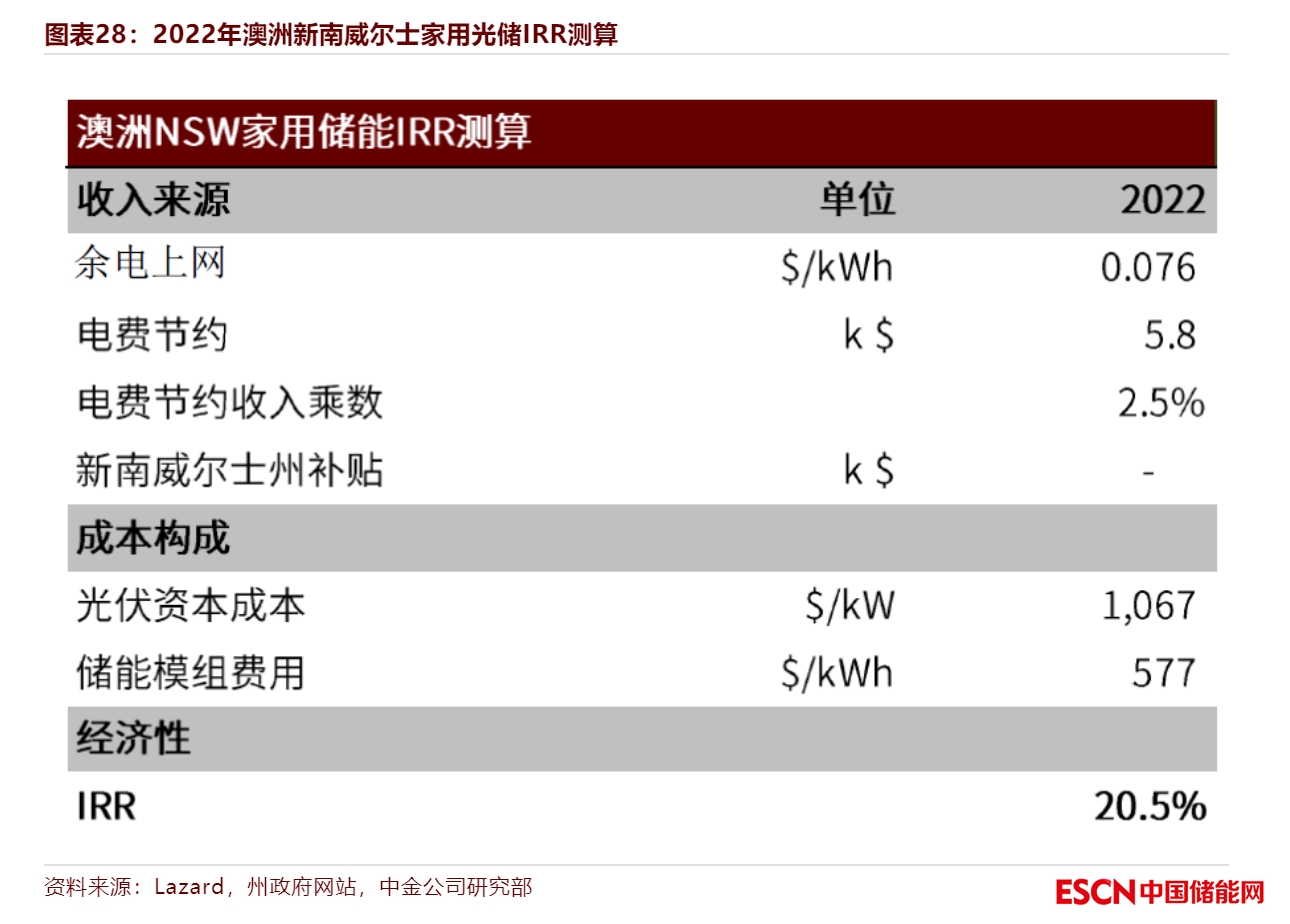 ? 分時(shí)電價(jià):以新南威爾士州為例,如采取分時(shí)電價(jià)的模式來計(jì)算電費(fèi),電力供應(yīng)商AGL的報(bào)價(jià)分別為峰平谷0.56/0.25/0.17澳元/kWh。假設(shè)家庭安裝10kW光伏并配置6kW/25kWh儲能,經(jīng)過我們的測算該項(xiàng)目IRR可達(dá)20.5%,具有較好的經(jīng)濟(jì)性。