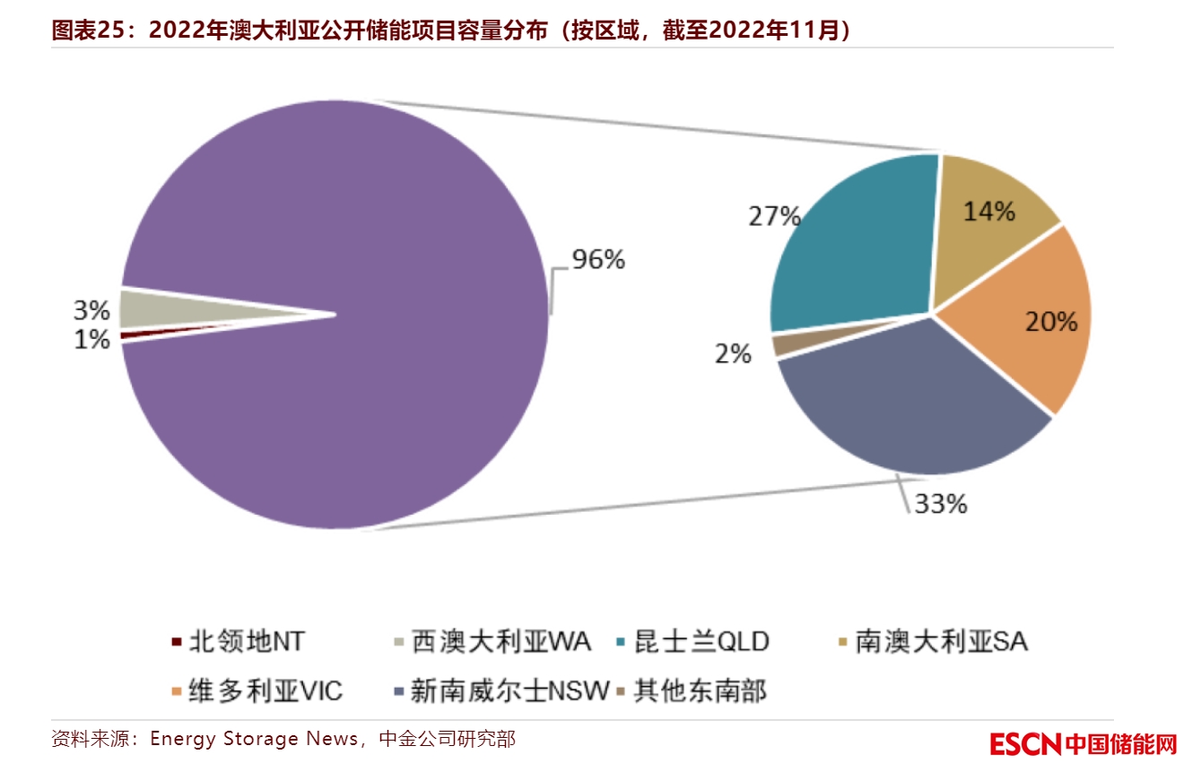 表前大儲或?qū)⑵鹆浚瑬|南部電網(wǎng)有望成為裝機(jī)主力。根據(jù)我們統(tǒng)計(jì),2022年以來澳大利亞市場公開電化學(xué)儲能項(xiàng)目儲備規(guī)模達(dá)10.7GW/25.4GWh,其中東南部電網(wǎng)規(guī)劃裝機(jī)容量超過96%,主要分布在新南威爾士州、昆士蘭州、維多利亞州。
