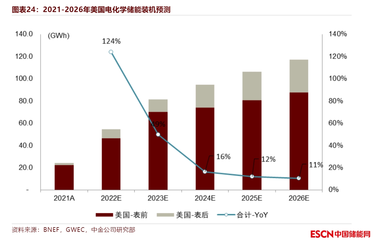短期看,我們預(yù)計(jì)2023年美國電力系統(tǒng)中新增電化學(xué)儲能裝機(jī)達(dá)81GWh,其中表前/表后市場分別為70/11GWh。展望未來,我們認(rèn)為美國加州、德州等表前市場對靈活性資源需求較高,表前大儲裝機(jī)有望維持較大規(guī)模,表后儲能有望隨光伏余電上網(wǎng)電價(jià)政策的改變而翻倍增長,預(yù)計(jì)2026年美國新增電化學(xué)儲能裝機(jī)117GWh,其中表前/表后分別為87/30GWh。