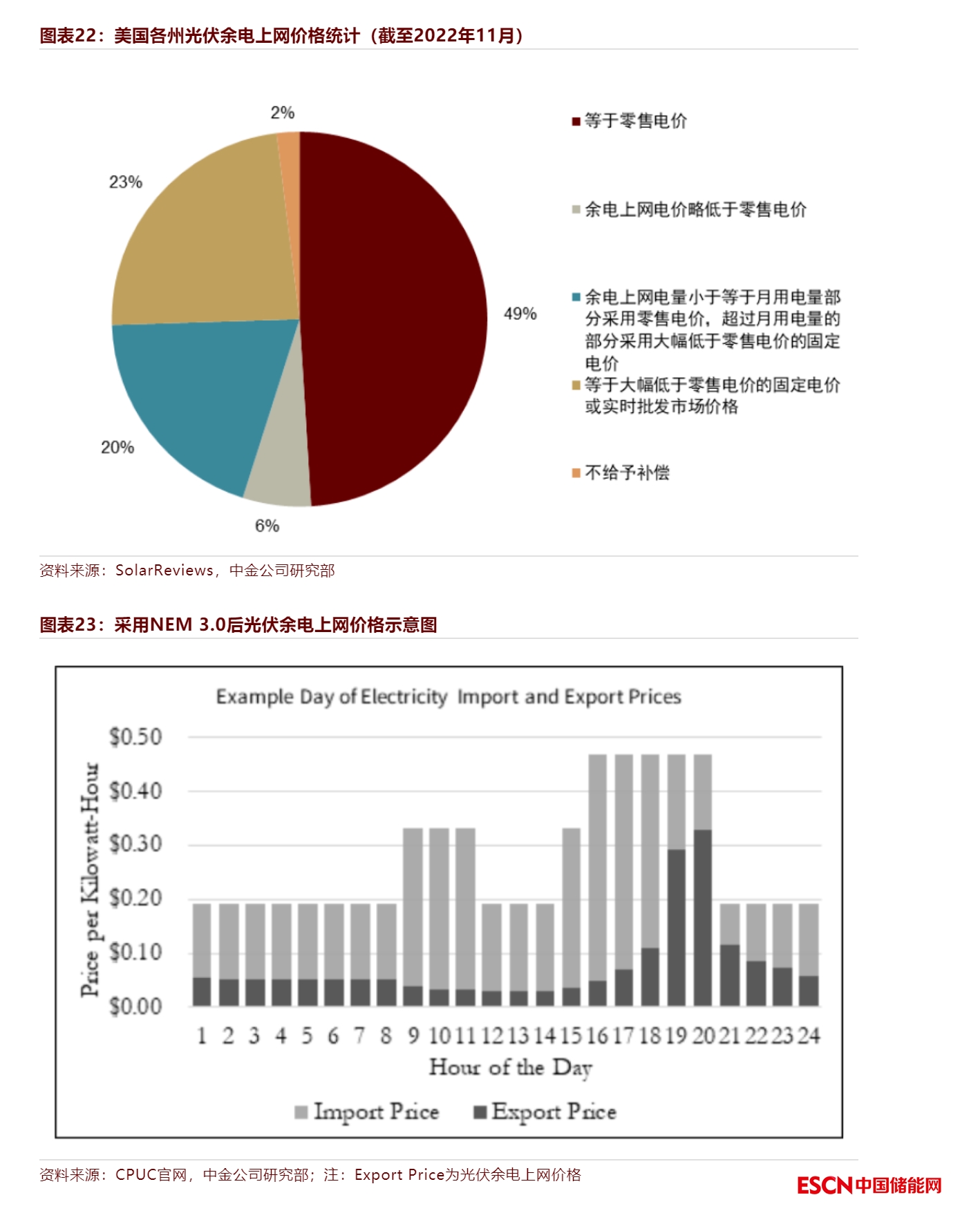 中長期持續(xù)關(guān)注各州補(bǔ)貼政策及能量時(shí)移價(jià)差。能量時(shí)移價(jià)差主要由各州零售電價(jià)和光伏余電上網(wǎng)電價(jià)決定,我們統(tǒng)計(jì)美國各州情況,發(fā)現(xiàn)當(dāng)前約75%州的光伏余電上網(wǎng)價(jià)格接近零售電價(jià),剩余各州(除夏威夷以外)雖光伏余電上網(wǎng)補(bǔ)償較少,但其零售電價(jià)水平較低、拉低能量時(shí)移價(jià)差,表后儲能經(jīng)濟(jì)性仍較差。但值得注意的是,加州公用事業(yè)委員會(huì)于2022年11月10日發(fā)布NEM 3.0提案[3],該提案計(jì)劃從凈計(jì)量轉(zhuǎn)向凈計(jì)費(fèi)制度、降低光伏余電上網(wǎng)受益,我們認(rèn)為這或?qū)⒃谘a(bǔ)貼退坡后、成為加州表后儲能裝機(jī)的又一支撐。