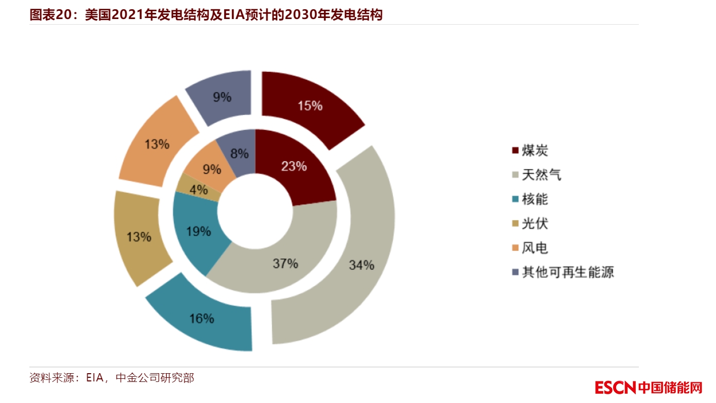 組件供給增強(qiáng),刺激光伏裝機(jī)、驅(qū)動(dòng)儲能配套。2022年6月6日美國總統(tǒng)令給予東南亞進(jìn)口組件兩年零關(guān)稅政策,10月美國正式暫停對東南亞四國光伏電池和組件征收雙反關(guān)稅的調(diào)查,12月2日晶科能源被暫扣的光伏組件獲美國海關(guān)首批放行,我們認(rèn)為這些意味著美國市場組件供給能力逐步增加,有望刺激下游需求、驅(qū)動(dòng)美國光伏裝機(jī),根據(jù)中金風(fēng)光公用環(huán)保組預(yù)測,2023年美國光伏裝機(jī)反彈,集中式/分布式裝機(jī)規(guī)模達(dá)20/14GW,光伏配套有望帶動(dòng)儲能增長。