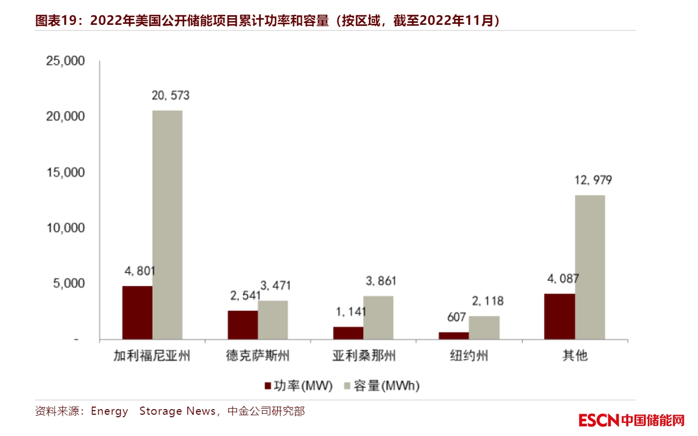 美國大儲市場局部放量趨勢明顯。根據(jù)我們統(tǒng)計(jì),2022年以來美國市場公開電化學(xué)儲能項(xiàng)目儲備規(guī)模達(dá)13.2GW/43.0GWh,其中加州占比超過一半,德州風(fēng)電占比較高、需求相對較少;我們認(rèn)為短期看美國加州、德州等局部地區(qū)放量趨勢明顯、儲備項(xiàng)目較多。
