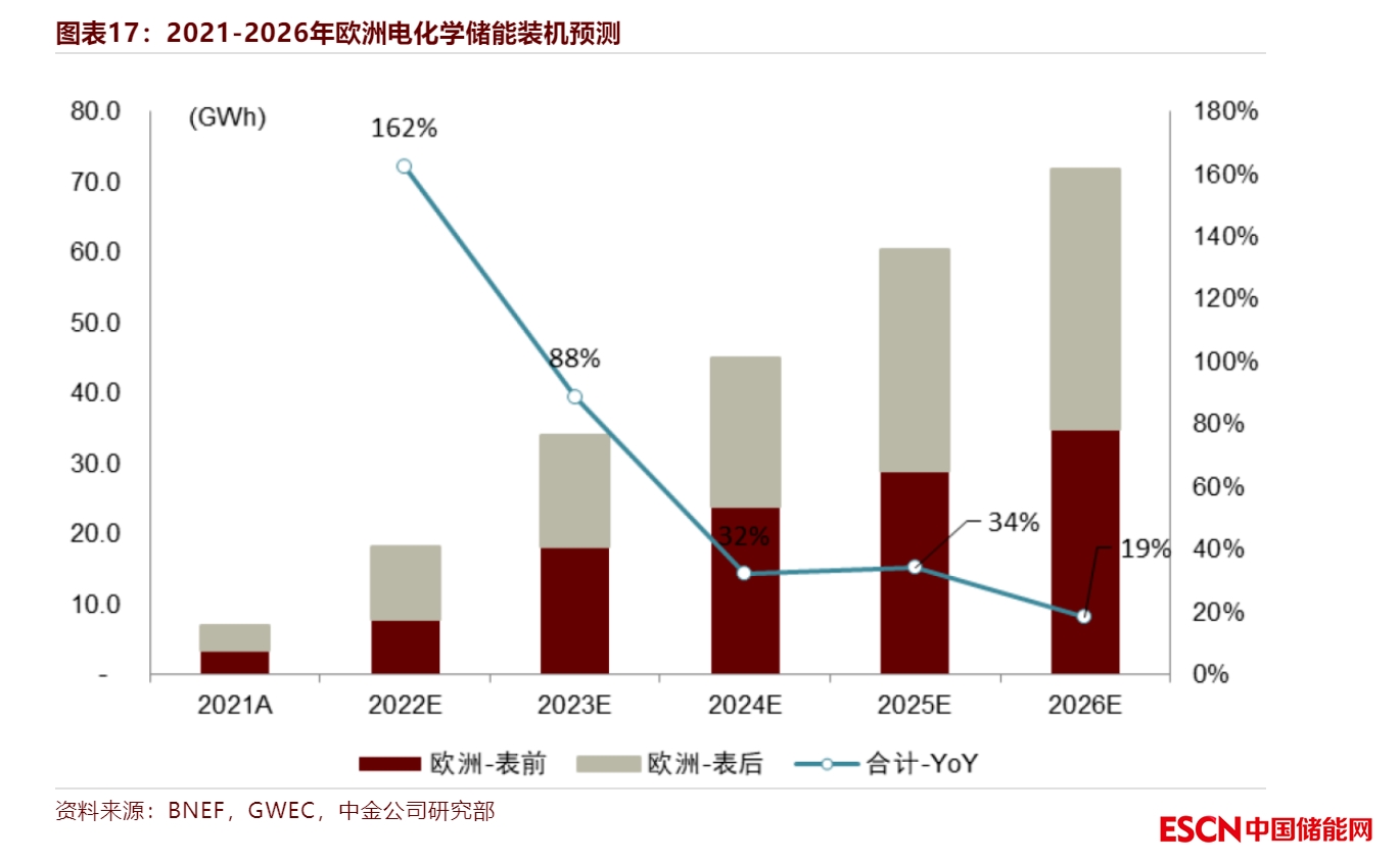 短期看,我們預(yù)計(jì)2023年歐洲電力系統(tǒng)中新增電化學(xué)儲能裝機(jī)達(dá)34GWh,其中表前/表后市場分別為18/16GWh。展望未來,我們認(rèn)為歐洲市場在表前靈活性資源缺乏和表后高電價(jià)驅(qū)動(dòng)下,儲能裝機(jī)有望維持較高的同比增速,預(yù)計(jì)2026年歐洲新增電化學(xué)儲能裝機(jī)72GWh,其中表前/表后分別為35/37GWh。