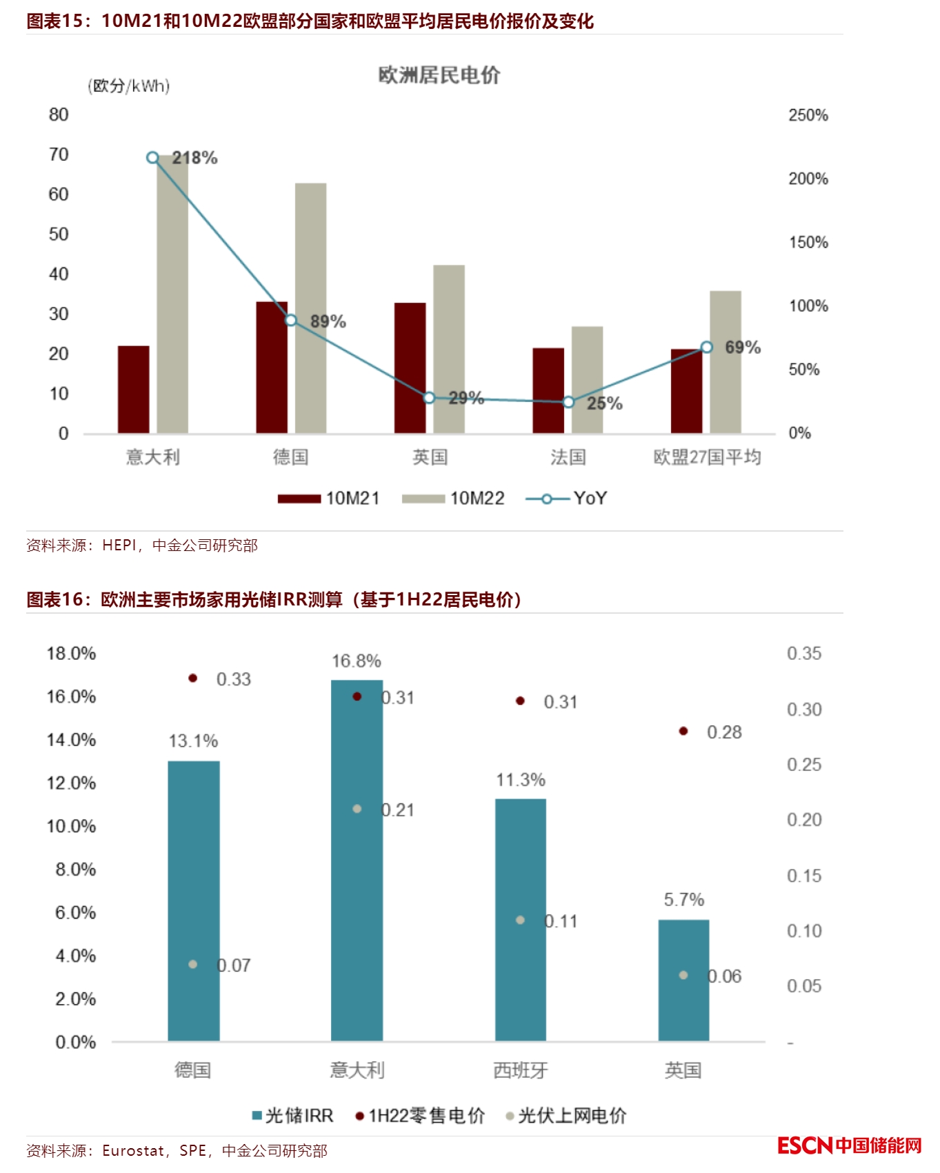 ? 短期:高電價(jià)持續(xù)、政策補(bǔ)貼有力,自發(fā)電經(jīng)濟(jì)性可觀、驅(qū)動(dòng)儲能裝機(jī)。歐洲能源危機(jī)以來,天然氣價(jià)格攀升、拉高批發(fā)市場電價(jià),高批發(fā)電價(jià)逐步傳導(dǎo)零售電價(jià)。根據(jù)歐盟Eurostat統(tǒng)計(jì)1H22各國家庭平均電價(jià),我們考慮各國針對家用光儲的補(bǔ)貼和針對光伏余電上網(wǎng)的價(jià)格機(jī)制,測算得意大利家用光儲IRR達(dá)16.8%,德國/西班牙分別達(dá)13.1%/11.3%。由于居民電價(jià)數(shù)據(jù)靜態(tài)、未考慮后續(xù)天然氣漲價(jià)的持續(xù)傳導(dǎo),我們認(rèn)為實(shí)際投資經(jīng)濟(jì)性會(huì)高于上述測算結(jié)果,短期看考慮政策補(bǔ)貼、家用光伏配儲具備較好的經(jīng)濟(jì)性。