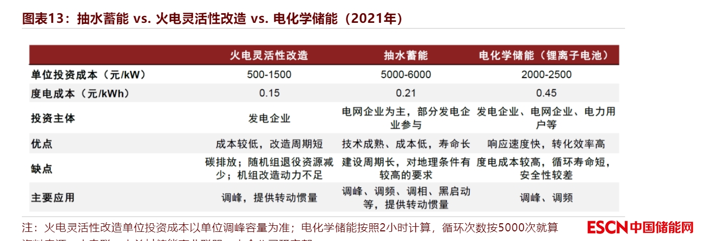 除電化學(xué)儲能等新型儲能外,抽水蓄能及火電靈活性改造亦可成為電網(wǎng)靈活性資源。目前抽水蓄能及火電靈活性調(diào)節(jié)度電成本均低于電化學(xué)儲能,但抽蓄建設(shè)周期長達(dá)6-8年,大規(guī)模貢獻(xiàn)調(diào)節(jié)性資源尚需時(shí)日;火電靈活性改造目前成本最低,但面臨改造成本與發(fā)電利用小時(shí)數(shù)下降等經(jīng)濟(jì)性制約,政策端需給予合理補(bǔ)償以提升火電廠靈活性改造積極性。