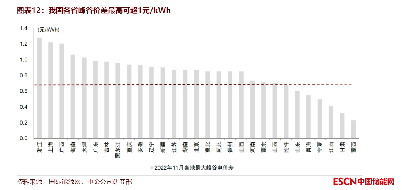 各省政策拉大工商業(yè)峰谷價(jià)差,提升工商業(yè)儲能經(jīng)濟(jì)性。2021年以來,廣東、河北、江西等各地方政府均推出政策拉大工商業(yè)峰谷價(jià)差,2022年11月,有20余省峰谷價(jià)差超0.7元/kWh,浙江、上海、廣西等地峰谷價(jià)差已達(dá)1.2元/kWh。