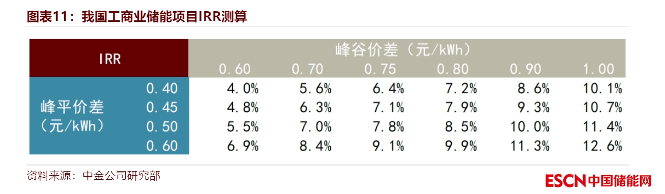 工商業(yè)儲能主要通過峰谷套利實(shí)現(xiàn)獲利。我們假設(shè)工商業(yè)儲能電池每天兩充兩放、使用壽命15年,則我們測算在峰谷價(jià)差0.8元/kWh、峰平價(jià)差0.5元/kWh時(shí),工商業(yè)儲能項(xiàng)目IRR可達(dá)8.5%,具備較好經(jīng)濟(jì)性。