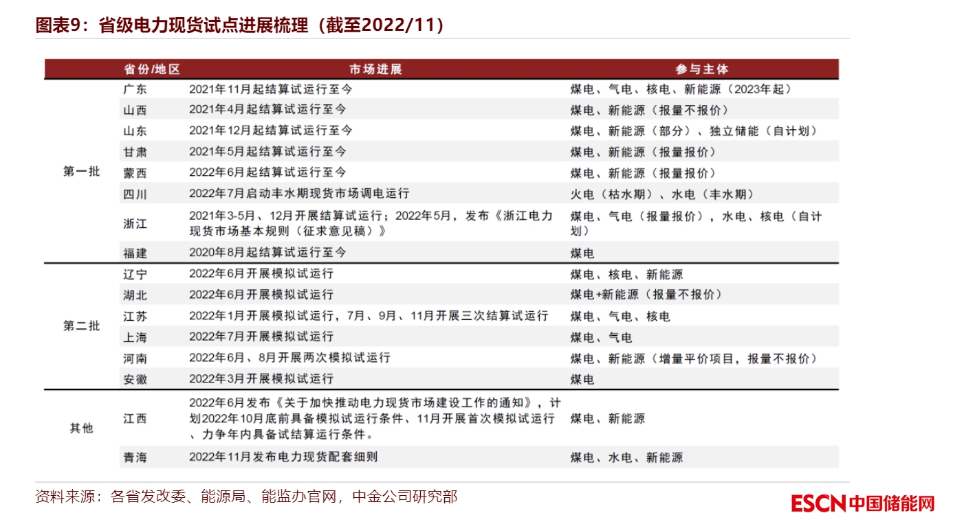 現(xiàn)貨市場基本規(guī)則出臺,電力現(xiàn)貨市場加速推進(jìn)。2022年11月,國家能源局發(fā)布《電力現(xiàn)貨市場基本規(guī)則(征求意見稿)》,對現(xiàn)貨市場組成、與輔助服務(wù)市場銜接、新能源及新興主體參與市場、市場限價(jià)、容量補(bǔ)償機(jī)制等內(nèi)容進(jìn)行了框架性約定。目前我國已有兩批省份/地區(qū)推進(jìn)電力現(xiàn)貨試點(diǎn),我們認(rèn)為《基本規(guī)則》為各省電力現(xiàn)貨市場規(guī)則制定了范本,有利于電力現(xiàn)貨市場在全國范圍內(nèi)進(jìn)一步推廣,現(xiàn)貨市場的分時(shí)電價(jià)機(jī)制將有利于儲能獲利模式逐步完善。