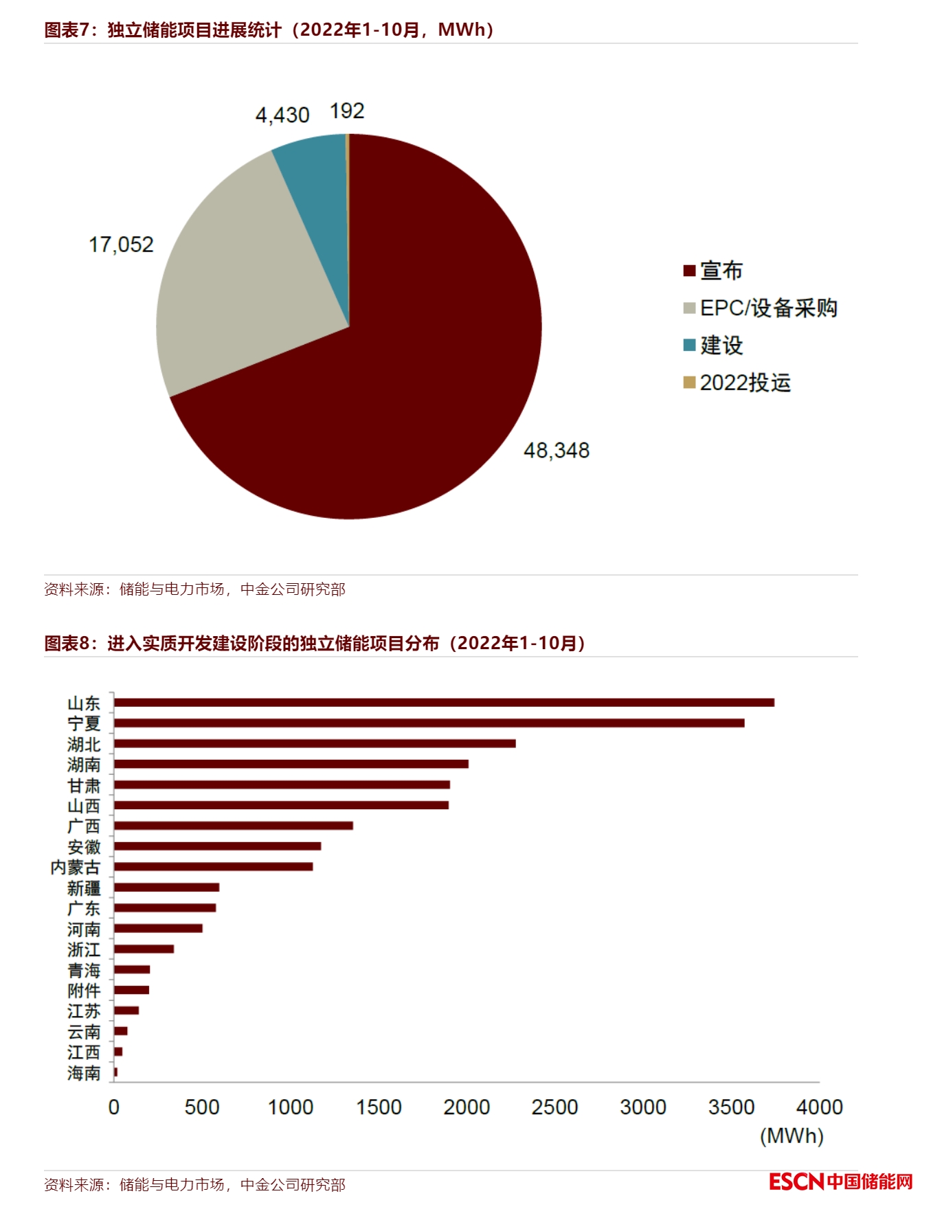 根據(jù)儲能與電力市場數(shù)據(jù)統(tǒng)計(jì),2022年1-10月已啟動(dòng)獨(dú)立儲能項(xiàng)目數(shù)量達(dá)231個(gè),總規(guī)模34GW/70GWh,已進(jìn)入EPC/設(shè)備招標(biāo)、項(xiàng)目建設(shè)和投運(yùn)等階段的項(xiàng)目達(dá)110個(gè),規(guī)模約10.9GW/21.7GWh。