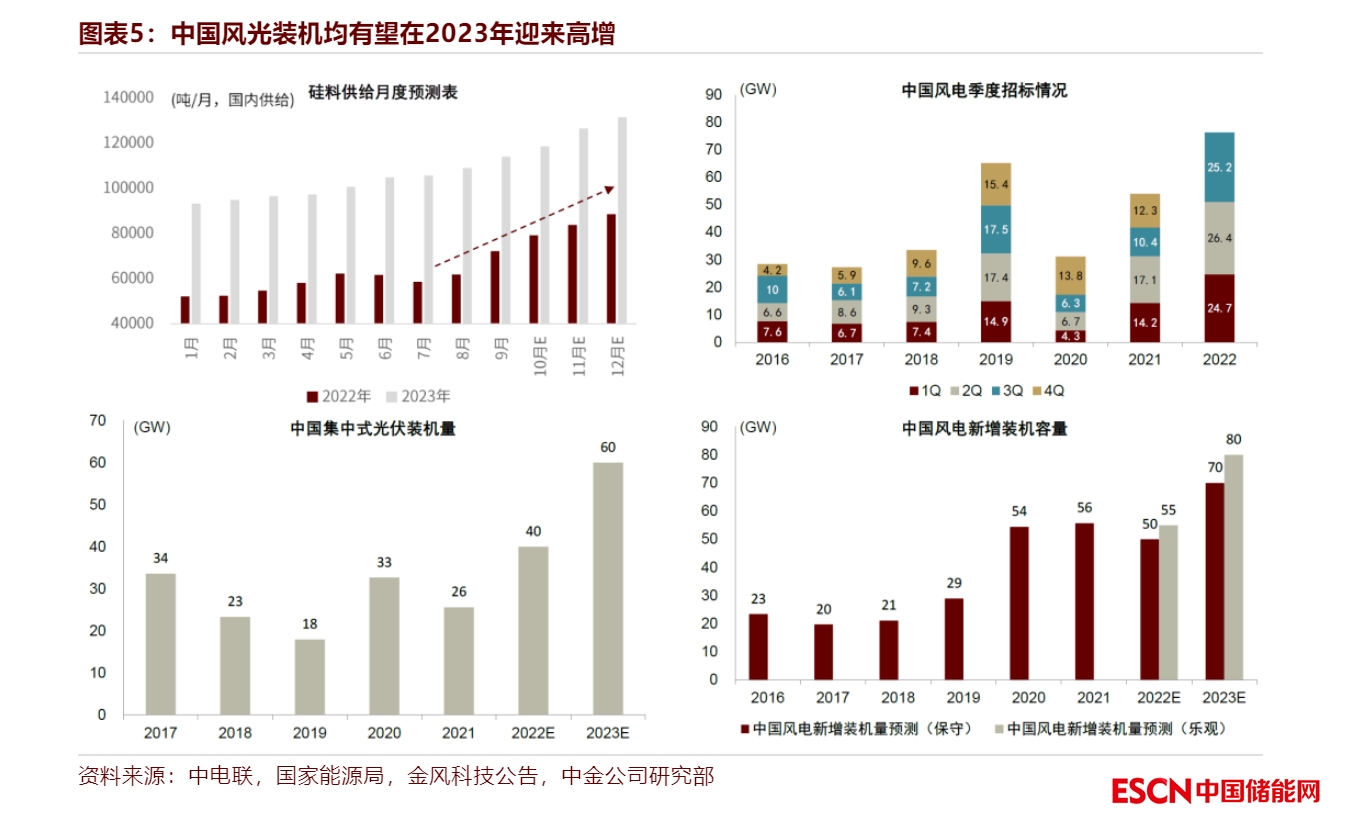 2023年風(fēng)光裝機(jī)有望維持高增長。2022年上半年受疫情反復(fù)、上游原材料價(jià)格高企提升裝機(jī)成本等影響,國內(nèi)集中式光伏/風(fēng)電僅分別實(shí)現(xiàn)裝機(jī)量約11.2GW/12.9GW。而四季度光伏硅料產(chǎn)能批量投放價(jià)格回落有望驅(qū)動(dòng)終端裝機(jī);風(fēng)電項(xiàng)目2022年招標(biāo)量創(chuàng)新高,我們預(yù)計(jì)裝機(jī)量也有望于2023年逐步兌現(xiàn)。