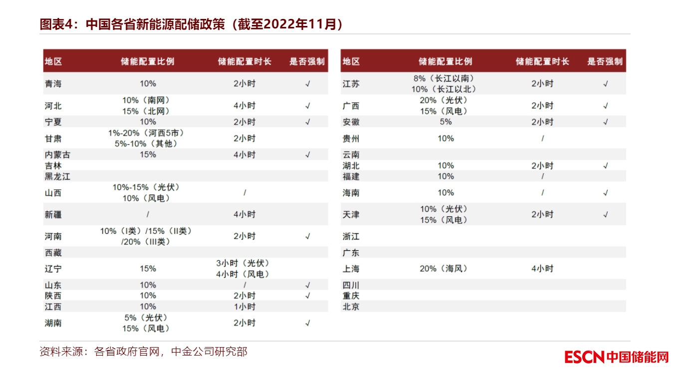 新能源強(qiáng)制配儲政策有望驅(qū)動(dòng)表前儲能快速發(fā)展。2020年以來,因風(fēng)光裝機(jī)過高對電網(wǎng)產(chǎn)生較大沖擊,部分省份開始探索并推進(jìn)新能源發(fā)電的儲能配套政策。截至目前,已有超20個(gè)省份提出新能源配儲要求,其中14個(gè)省份為強(qiáng)制配置要求,多數(shù)地區(qū)要求配置儲能比例在10%-20%,配置時(shí)長在2小時(shí)以上。