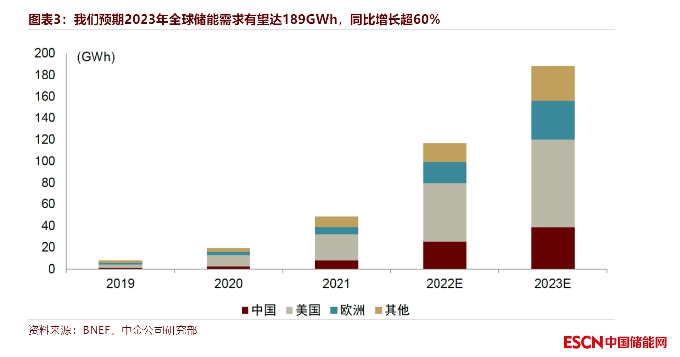 中國儲能網(wǎng)訊:2023年我們預(yù)期中美風(fēng)光裝機(jī)高增長驅(qū)動(dòng)表前配儲需求,歐洲能源危機(jī)戶用居民電價(jià)維持高位驅(qū)動(dòng)表后需求、表前大儲項(xiàng)目增長亦有望迎來高增速,我們看好2023年全球儲能鋰電池需求量達(dá)189GWh,同比增長超60%。