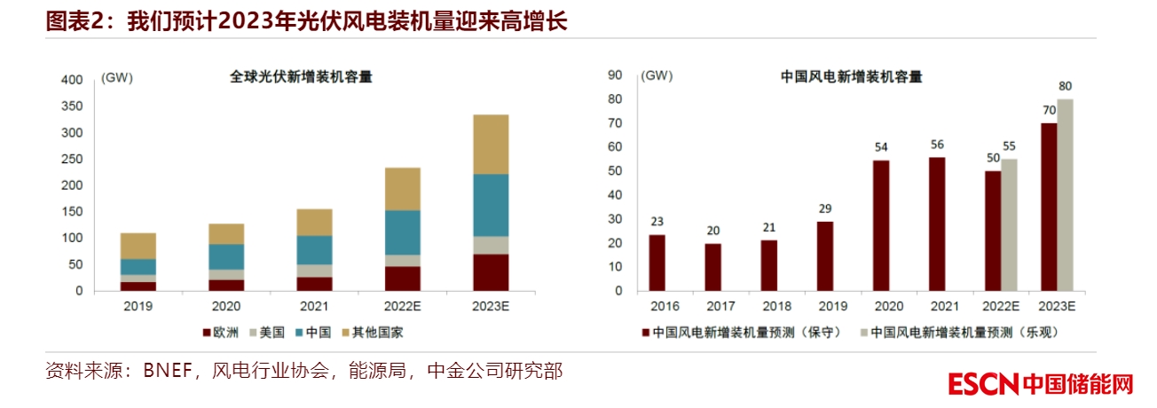 我們認(rèn)為全球儲能發(fā)展的核心驅(qū)動(dòng)力在于波動(dòng)性可再生能源發(fā)電量增長增加電力系統(tǒng)不穩(wěn)定性,催生對儲能等靈活性資源的需求。我們預(yù)期2023年全球風(fēng)光裝機(jī)迎來高增長。我們預(yù)期23年光伏全球需求有望同比增長40%-50%至近350GW、2023年中國風(fēng)電裝機(jī)量將達(dá)到70-80GW,同比增長約30%-40%,驅(qū)動(dòng)全球儲能配置需求。