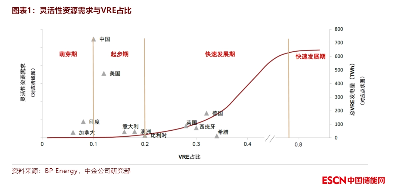 我們認(rèn)為全球儲能發(fā)展的核心驅(qū)動(dòng)力在于波動(dòng)性可再生能源發(fā)電量增長增加電力系統(tǒng)不穩(wěn)定性,催生對儲能等靈活性資源的需求。如我們在《儲能,鋰電的第二成長曲線已來臨》報(bào)告總中所述,在波動(dòng)性可再生能源發(fā)展初期,電力系統(tǒng)中可調(diào)火電及抽水蓄能足以應(yīng)對VRE帶來的擾動(dòng),VRE發(fā)電量可盡數(shù)并網(wǎng)。隨著VRE裝機(jī)量和發(fā)電量逐漸提升至10%-20%的臨界值時(shí),電力系統(tǒng)對儲能等靈活資源的需求將快速增長。從全球范圍內(nèi)看,目前希臘、德國等歐洲國家VRE占比高達(dá)30%+,中國、澳洲、美國市場VRE占比位于10%-20%,我們預(yù)計(jì)全球主要國家對靈活性資源需求均將隨可再生能源發(fā)展而迎來快速提升。