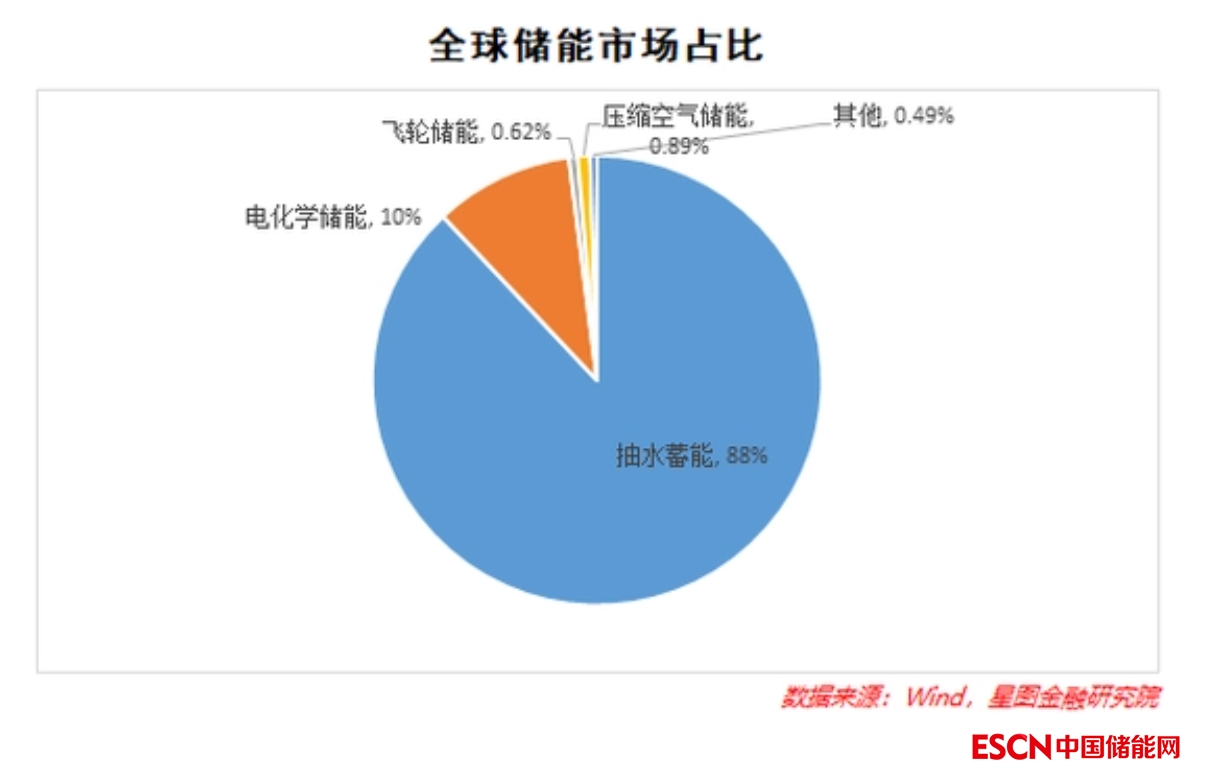而對于儲能而言,技術(shù)路線多樣,每一條技術(shù)路線均對應(yīng)一個完整的產(chǎn)業(yè)鏈,又對應(yīng)著不同的應(yīng)用場景,因此在投資中更具復(fù)雜性。以當(dāng)前儲能的技術(shù)路線來看,主要以抽水蓄能為主,截至2021年,全球儲能市場裝機(jī)量為205.3GW,抽水蓄能在全球的儲能市場中占比約88%,其次為包括鉛酸電池、鋰電池、鈉離子電池、全釩液流電池等在內(nèi)的電化學(xué)儲能,占比約10%。其余的壓縮空氣儲能、飛輪儲能、氫儲能等儲能方式占比較小,不足2%。