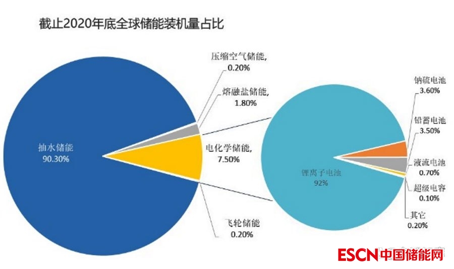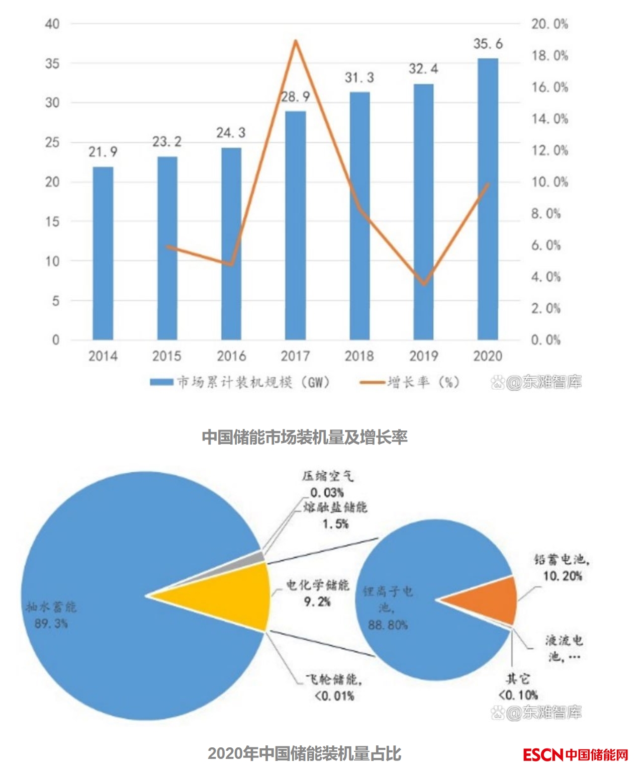 中國儲(chǔ)能市場穩(wěn)步擴(kuò)張,截至2020年底,中國已投運(yùn)儲(chǔ)能項(xiàng)目累計(jì)裝機(jī)規(guī)模為35.6GW,占全球市場總規(guī)模的18.6%,同比增長9.8%,漲幅比2019年同期增長6.2%。其中抽水蓄能的累計(jì)裝機(jī)規(guī)模最大,達(dá)到31.79GW,占比達(dá)到了89.3%。電化學(xué)儲(chǔ)能裝機(jī)規(guī)模占比僅為9.2%。