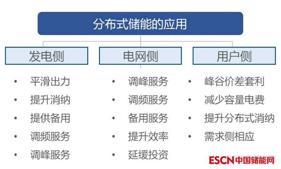 分布式儲(chǔ)能系統(tǒng)因?yàn)榻尤胛恢渺`活,應(yīng)用場景更為廣泛。結(jié)合電力系統(tǒng)構(gòu)成,分布式儲(chǔ)能的應(yīng)用場景主要包括發(fā)電側(cè)、電網(wǎng)側(cè)和用電側(cè),具體分為以下六大類:新能源電站配套儲(chǔ)能、用戶側(cè)儲(chǔ)能、微電網(wǎng)儲(chǔ)能、分布式發(fā)電交易配套、增量配電網(wǎng)儲(chǔ)能和電網(wǎng)側(cè)儲(chǔ)能。