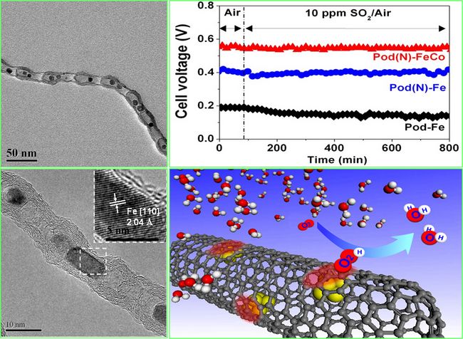 實(shí)驗(yàn)和理論研究進(jìn)一步證實(shí),在這一體系中,包裹納米金屬鐵的碳壁阻斷了反應(yīng)氣體與鐵納米粒子的直接接觸,從原理上避免了反應(yīng)過程中活性金屬鐵納米粒子的深度氧化,以及反應(yīng)氣氛中其它有害組分對催化劑的中毒,從而在根本上解決了納米金屬鐵作為燃料電池陰極催化劑的穩(wěn)定性難題。進(jìn)一步對包裹金屬納米粒子的碳壁進(jìn)行雜原子(如氮原子)摻雜和改變包裹其中的金屬納米粒子組分,對電極材料的催化性能起到明顯的調(diào)變作用。當(dāng)碳納米管管壁氮摻雜濃度為3.3 wt%,包裹Fe-Co納米合金時(shí),在完全相同的操作條件下,電池的功率密度可以達(dá)到以20%Pt-C催化劑的60%。特別是,在10 ppm的有害成分硫(SO2)存在時(shí),電池仍保持了優(yōu)異的活性和穩(wěn)定性。這一結(jié)果近期被《德國應(yīng)用化學(xué)》 (Angewandt Chemie International Edition, 2012, DOI: 10.1002/anie.201204958)在線發(fā)表。
