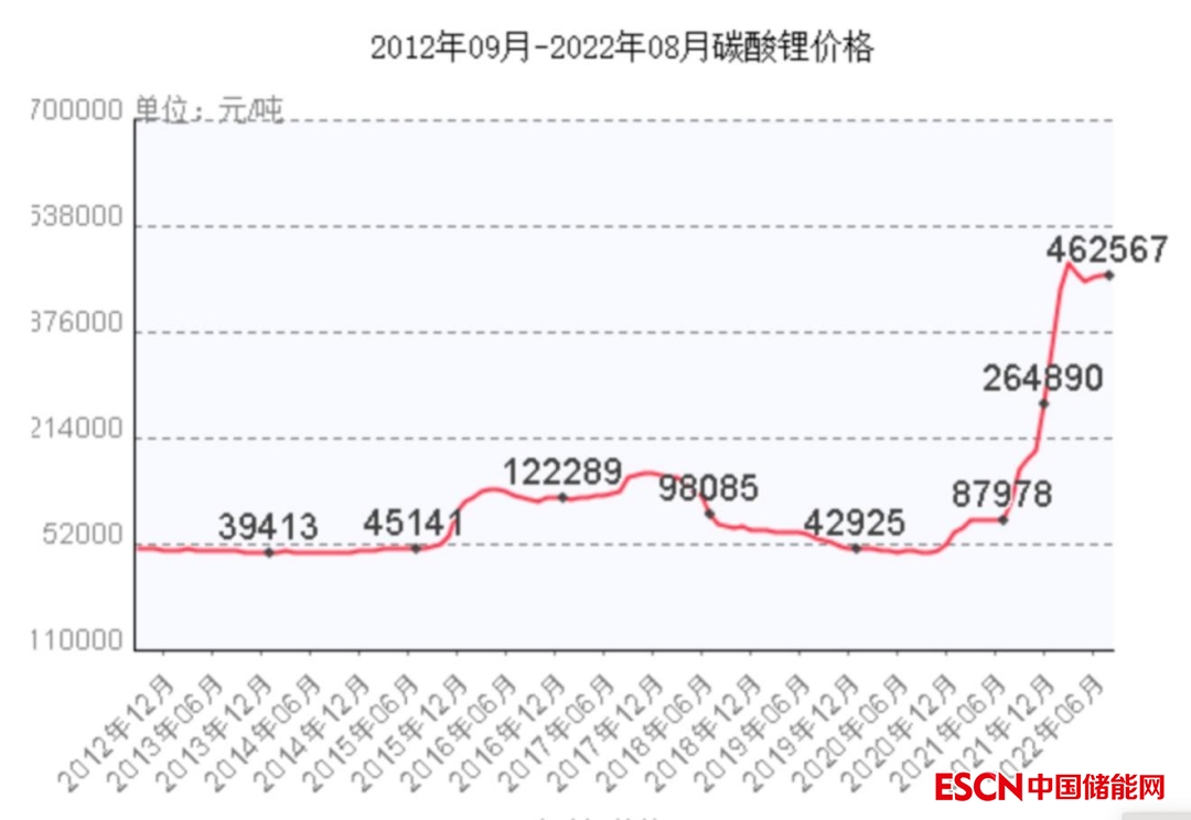 磷酸鐵鋰電池不光在儲能中是主流路線,在新能源車中也是。在近幾年新能源車和儲能的強(qiáng)勢合攻下,上游碳酸鋰價格已經(jīng)從2020年的4.3萬元/噸上漲到了如今的46萬元/噸,并維持在高位。