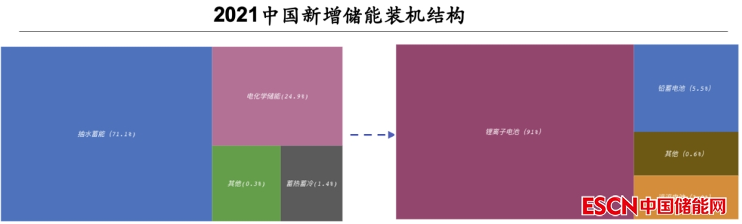 目前,短時儲能的鋰離子電池和長時儲能的抽水蓄能方案在市場中的主導(dǎo)地位非常明顯。根據(jù)《2022儲能產(chǎn)業(yè)應(yīng)用研究報告》的數(shù)據(jù),在2021年中國新增儲能裝機(jī)結(jié)構(gòu)中,抽水蓄能占據(jù)71%的份額,而在新裝機(jī)的電化學(xué)儲能中,鋰離子電池占據(jù)了91%的份額。