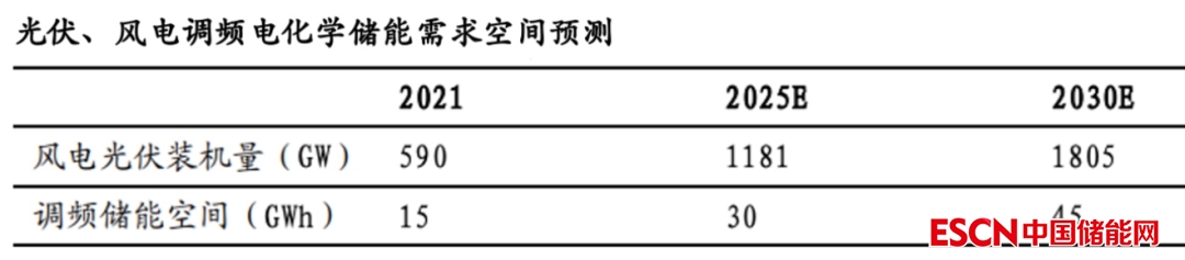 目前火電機(jī)組調(diào)頻容量配比為額定功率的2.5%,新能源發(fā)電配比為5%。由此計算得到2025年和2030年的調(diào)頻儲能空間約30GWh和45GWh。