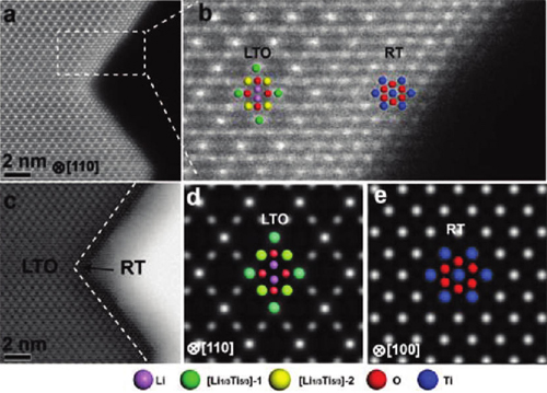 研究人員通過調(diào)控水熱反應(yīng)中Li:Ti投料比,合成出高質(zhì)量鈦酸鋰納米片負極材料(LTO-600)和側(cè)面包覆有金紅石TiO2的鈦酸鋰納米片負極材料(LTO-RT-600)。他們與中科院物理所和日本的科研人員合作,通過球差校正透射電子顯微鏡(STEM)直接觀察到原子級分辨的圖像,證明沿Li4Ti5O12 [001]方向上的確原位生長出1納米厚的金紅石TiO2包覆層(圖1)。