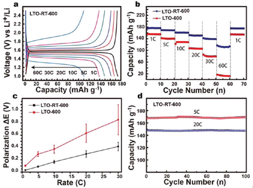 電化學(xué)性能測試表明,金紅石TiO2包覆后,鈦酸鋰負極材料的極化降低,比容量、高倍率性能和循環(huán)穩(wěn)定性顯著提高(圖2)。在1C條件下,其比容量為178 mA h g−1。即使在60C條件下,仍具有110 mA h g−1的比容量,比包覆前提高了10倍。為了揭示性能提高的原因,他們通過交流阻抗和Li擴散系數(shù)測量發(fā)現(xiàn),金紅石TiO2包覆后,電極材料體系的界面電荷轉(zhuǎn)移阻抗降低了一半,Li的傳輸能力提高了10倍。仔細研究分析發(fā)現(xiàn),這一包覆的高效性在于金紅石TiO2僅存在于側(cè)面,并未完全包覆鈦酸鋰納米片,因此不會阻礙鋰離子沿Li4Ti5O12 [110]方向的傳輸。