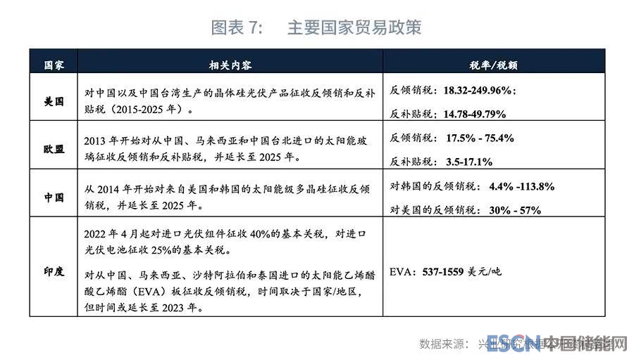 隨著可再生能源制造產(chǎn)業(yè)鏈全球化,各國也開始采取的不同程度的貿(mào)易保護措施。目前已有美國、歐盟、中國、印度等國出臺了對于他國的貿(mào)易制裁,而俄烏危機使得“光伏+儲能”供應鏈更易受到貿(mào)易政策風險的影響。自2011年起,歐美國家針對中國光伏行業(yè)共施行了五輪制裁,歐盟對中國、馬來西亞等國家產(chǎn)電池片及其他關鍵環(huán)節(jié)征收反傾銷稅率,最高達47.6%,而美國的四輪制裁從僅針對光伏產(chǎn)品的反傾銷、反補貼制裁,過渡到對中國進口的組件、逆變器等光伏元件征收10%的關稅、通過調(diào)查中國光伏組件制造商是否存在逃避關稅行為遏制中國向東南亞國家轉(zhuǎn)移產(chǎn)能。中國也從2014年開始對歐盟、美國和韓國等硅片生產(chǎn)商征收反傾銷和反補貼稅。2022年印度對來自周邊國家中國、馬來西亞、沙特阿拉伯和泰國的太陽能玻璃和EVA粒子征收“雙反稅”。此外,美國還對越南、馬來西亞、柬埔寨和泰國的進口商品規(guī)避反傾銷和反補貼稅展開調(diào)查,但為保障本國能源穩(wěn)定,2022年6月起又再度取消對東南亞國家的電池和組件的關稅(最長2年),2022年7月,隆基、晶科、新特三家企業(yè)被剔除進口禁令的名單。這一系列的貿(mào)易政策的出臺與撤銷,使得相關產(chǎn)業(yè)鏈的風險不確定性加劇。