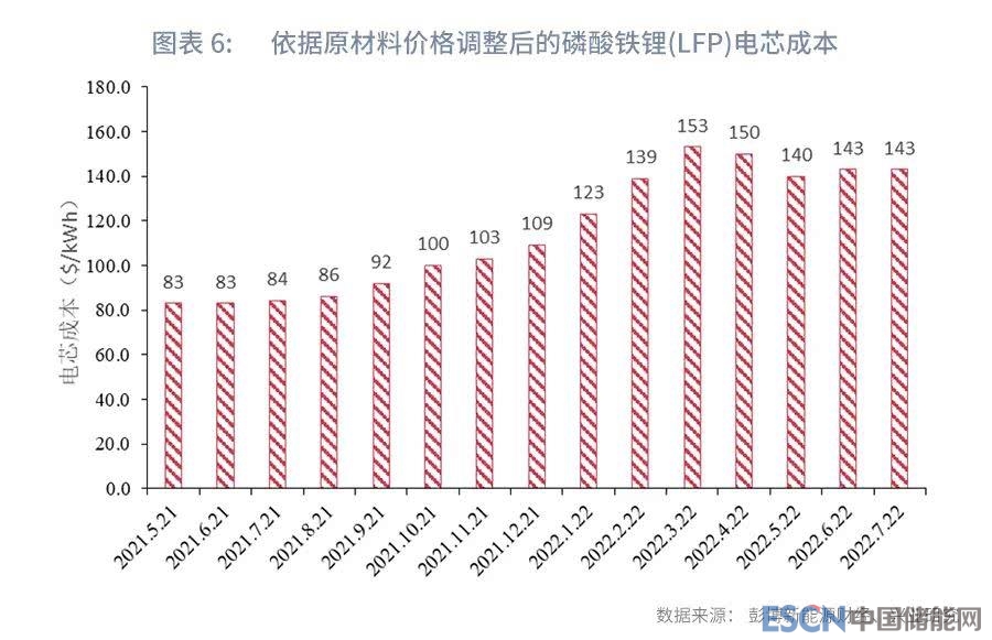儲能的重要環(huán)節(jié)電池的價格在新能源車及可再生能源需求的雙重帶動下,主要原材料碳酸鋰的供應受限,電芯價格遭到嚴重影響。原材料價格調(diào)整后的磷酸鐵鋰(LFP)電芯成本相對2021年5月水平增長84%,在2022年3月達到峰值153美元/kWh,至今其成本均未低于140美元/kWh [13]。根據(jù)彭博新能源財經(jīng)預測,2022年全年鋰價格將保持高位,市場處于高度緊張狀態(tài)。烏克蘭的供應全球70%的氖氣(芯片制作特種氣體),俄烏危機使得氖氣價格從1700元/立方米上漲至15000元/立方米,上漲近8倍[14],氖氣資源供應短缺提高了制造成本也將影響光伏逆變器及儲能逆變器的生產(chǎn)。