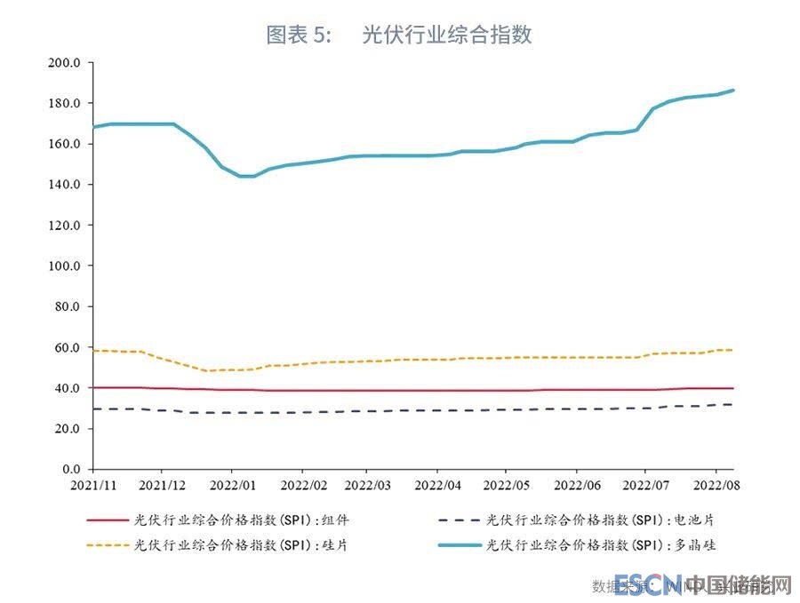俄烏危機提高了 “光伏+儲能”產(chǎn)業(yè)鏈的制造成本。成本差異決定了可再生能源產(chǎn)業(yè)的競爭力,而制造成本過高不利于光伏+儲能供應鏈的多元化及長遠發(fā)展。俄烏危機造成的全球能源短缺及可再生能源短時間需求暴增,引發(fā)了原材料價格的暴增。硅料作為光伏產(chǎn)業(yè)鏈中的決定性環(huán)節(jié),其成本決定整個產(chǎn)業(yè)鏈價格變動,據(jù)中國有色金屬工業(yè)協(xié)會硅業(yè)分會披露數(shù)據(jù),年初至今硅料價格最高達31萬元/噸。此外俄羅斯引發(fā)的天然氣價格提升,進一步升高了如光伏玻璃等以天然氣為主要能源的光伏組件的成本。根據(jù)SOLARZOOM發(fā)布的光伏行業(yè)綜合價格指數(shù)(SPI),2022年1月至今,硅料價格的上漲對于其下游均造成影響,硅料價格順利傳導至硅片,電池片環(huán)節(jié)指數(shù)稍有提升,但組件指數(shù)變動基本維持穩(wěn)定,意味著整個光伏產(chǎn)業(yè)鏈成本壓力集中于組件及電池環(huán)節(jié)。