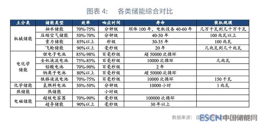 儲能是全球能源轉(zhuǎn)型中不可或缺的環(huán)節(jié),儲能在以可再生能源為主體的新型電力系統(tǒng)中的定位主要是利用其快速功率調(diào)節(jié)性能以及儲存能量的特性,在表前、表后側(cè)承擔不同的角色,進而提升新型電力系統(tǒng)的靈活性、經(jīng)濟性和安全性[10]。當前市場主流儲能方式主要有機械儲能、電化學儲能和電磁儲能等,下表針對儲能的利用效率、響應時間、使用壽命及裝機規(guī)模等特點進行綜合對比。其中,抽水儲能、壓縮空氣儲能和電化學儲能由于裝機規(guī)模大且可存儲時長高適用于可再生能源接入、應急電源等大規(guī)模、大容量的應用場合;電磁、飛輪、重力儲能等因響應速度快適用于需要提供短時較大脈沖功率的場合,如應對提高用戶電能質(zhì)量,抑制電力系統(tǒng)低頻振蕩、提高電力系統(tǒng)穩(wěn)定性等。