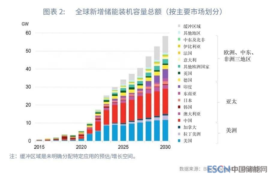 隨著各國政策不斷加碼,全球能源消費結構向低碳化轉(zhuǎn)型腳步加快,驅(qū)動儲能行業(yè)逐步由商業(yè)化初期進入規(guī)?;l(fā)展階段,2021年是儲能行業(yè)的爆發(fā)年,全球主要的電化學儲能配備國家/地區(qū)包括美國、中國、歐盟、澳大利亞等。其中歐盟、澳大利亞等國家/地區(qū)由于居民側(cè)電費遠高于工商業(yè)電費、電網(wǎng)穩(wěn)定性欠佳且用戶側(cè)儲能補貼多樣化等因素推動了其表后儲能的安裝需求。美國及中國由于政策驅(qū)動、新能源大規(guī)模并網(wǎng)后對電網(wǎng)穩(wěn)定性需求提升、電力市場化交易機制套利等不同因素,表前儲能市場需求更為強勁。根據(jù)彭博新能源財經(jīng)的最新預測,從2022年到2030年,全球儲能市場將以30%的復合年速率增長,其中2030年新增儲能裝機容量將達到58GW/178GWh,是2021年的五倍多,美國和中國仍然是全球最大的兩個市場,到2030年在預期儲能裝機容量中的占比將達54%[4]。