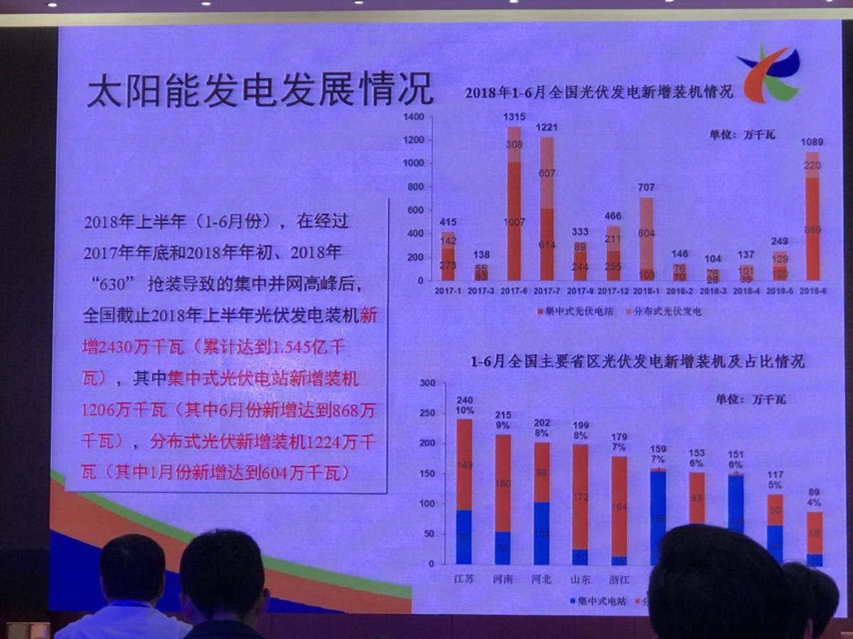 中國儲(chǔ)能網(wǎng)訊:2018年7月25-26日,領(lǐng)跑者計(jì)劃及去補(bǔ)貼路徑研討會(huì)在北京召開。會(huì)上,國家發(fā)改委能源研究所可再生能源發(fā)展中心副主任陶冶作可再生能源激勵(lì)政策發(fā)展和光伏平價(jià)上網(wǎng)相關(guān)分析報(bào)告。他透露,2018年上半年光伏發(fā)電裝機(jī)新增2430萬千瓦(累計(jì)1.545億千瓦),其中集中式光伏電站新增裝機(jī)1206萬千瓦(其中6月份新增達(dá)到868萬千瓦),分布式光伏新增裝機(jī)1224萬千瓦。