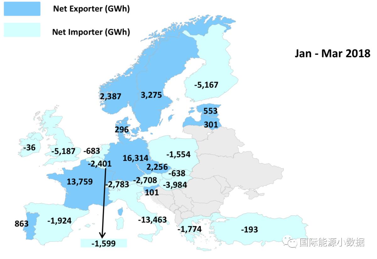 中國儲能網(wǎng)訊:根據(jù)國際能源署(IEA)最新發(fā)布的報告,2018年1月至3月經(jīng)合組織中的歐洲國家電力貿(mào)易地圖如下——