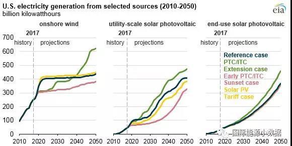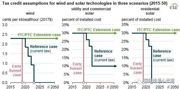 美國ITC和PTC兩種補貼措施的未來走向如何?按照現(xiàn)有法律,陸上風(fēng)電的PTC在2017年以后逐年下降20%,2019年以后開建(一般4年完工)的風(fēng)電項目完全不享受PTC優(yōu)惠。針對太陽能的ITC優(yōu)惠自2020年起逐年下降,大型光伏的優(yōu)惠從30%最終降至10%,而居民屋頂光伏到2022年以后完全取消。美國的可再生能源補貼走向也取決于兩黨政治的平衡,也有可能出現(xiàn)提前在2019年全部取消稅收減免或者到2050年一直維持現(xiàn)有稅負(fù)減免兩種極端情況。這樣ITC和PTC的未來走向就有以下三種情景:1)按照現(xiàn)有法律稅負(fù)減免幅度逐步退坡(參考情景);2)2019年提前終結(jié)所有稅收減免;3)到2050年一直維持現(xiàn)有稅收減免幅度。