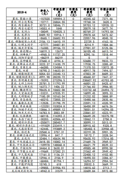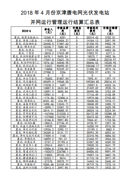 2018年4月份京津唐電網(wǎng)光伏發(fā)電站并網(wǎng)運行管理運行結算匯總表如下: