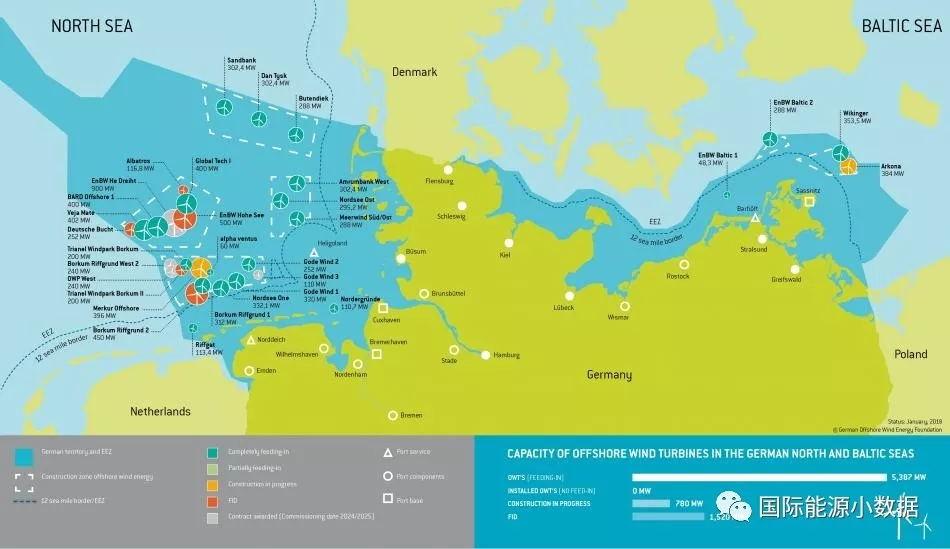 中國(guó)儲(chǔ)能網(wǎng)訊:2017年德國(guó)新吊裝了222臺(tái)海上風(fēng)力發(fā)電機(jī),新增裝機(jī)容量1.25吉瓦,比上一年增長(zhǎng)30%,占全球海上風(fēng)電增量的40%。到2017年末,德國(guó)海上風(fēng)機(jī)共有1169座(997座在北海,172座在波羅的海),總裝機(jī)容量5.38吉瓦,2017年發(fā)電量179億千瓦時(shí),占全國(guó)發(fā)電量的2.7%,就業(yè)崗位約20000人。按照德國(guó)政府的目標(biāo),2020年德國(guó)海上風(fēng)電裝機(jī)將達(dá)到7.7吉瓦,2030年達(dá)到15吉瓦。2017年海上風(fēng)機(jī)的平均單機(jī)容量為6兆瓦,預(yù)計(jì)2025年增至13-15兆瓦。