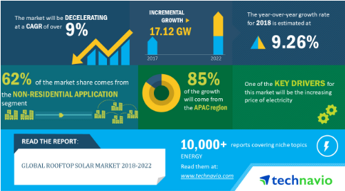 中國(guó)儲(chǔ)能網(wǎng)訊:市場(chǎng)研究分析機(jī)構(gòu)Technavio預(yù)測(cè),全球屋頂太陽(yáng)能市場(chǎng)在2018-2022年的復(fù)合年增長(zhǎng)率將超過(guò)9%。