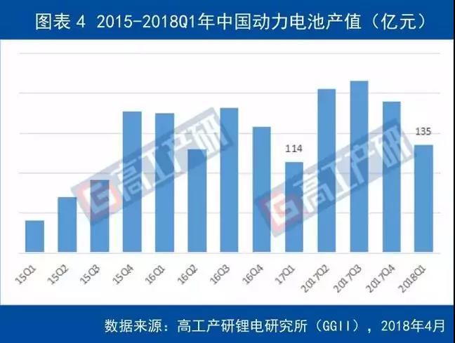 動力電池價格在持續(xù)的下滑,但在出貨量的大幅增長,2018年一季度中國動力電池產(chǎn)值達到135億元,同比增長18.42%。動力電池產(chǎn)值增速遠低于出貨量增速,主要因為新能源補貼政策進一步退坡,補貼力度大幅下滑,主機廠將部分成本壓力轉(zhuǎn)嫁到動力電池,使動力電池價格繼續(xù)下滑。