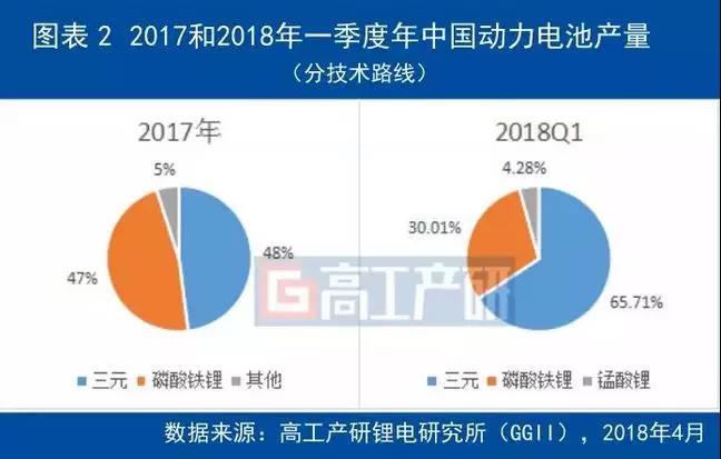 從技術(shù)路線來看,2018年一季度動力電池出貨量中三元動力電池占比達65.71%,占比上升17.71個百分點,主要因為:1)補貼政策對高能量密度的傾向性明顯,間接推動三元動力電池發(fā)展;2)主要搭載三元動力電池的新能源乘用車快速發(fā)展,成為新能源汽車增長的主要動力。