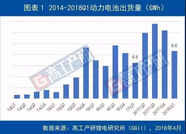 中國儲能網(wǎng)訊:高工產(chǎn)研鋰電研究所(GGII)調(diào)研數(shù)據(jù)顯示,2018年第一季度中國動力電池出貨量8.6GWh,同比增長32.85%。