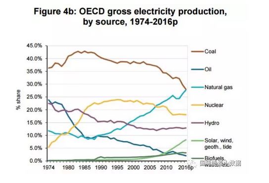 中國儲能網(wǎng)訊:經(jīng)濟合作與發(fā)展組織(OECD)號稱是“富人俱樂部”,因為35個成員國都是西方發(fā)達國家。2016年經(jīng)合組織國家的發(fā)電總量達到10.964萬億千瓦時,比2015年(10.920萬億千瓦時)略增0.4%。從電源結(jié)構(gòu)來看,2016年經(jīng)合組織國家的煤電比例為27.9%,略高于天然氣發(fā)電(27.7%),其他電源包括核電(18.0%)、水電(12.9%)、太陽能、風(fēng)電、地?zé)岬瓤稍偕茉矗?.2%)、生物質(zhì)能源(3.2%)、燃油發(fā)電(2.0%)。