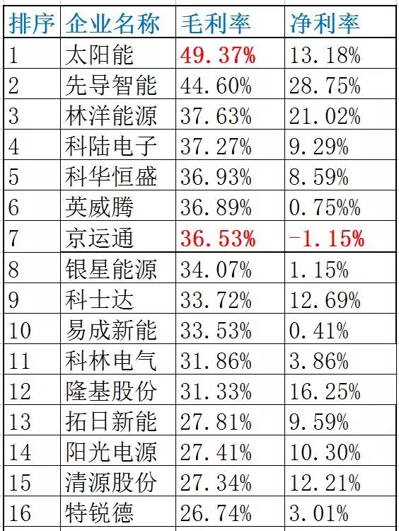 光頭君發(fā)現(xiàn),毛利率和凈利率最高的是先導(dǎo)智能;科士達(dá)的表現(xiàn)也非常搶眼;京運(yùn)通的毛利率超過36%,但凈利率卻為—1.15%,與去年相比略差強(qiáng)人意。此外,協(xié)鑫集成、航天機(jī)電、中利集團(tuán)、向日葵的凈利率為“負(fù)”,需要在下半年再接再厲。
