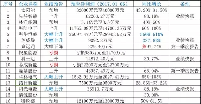 從凈利潤來看,不難發(fā)現(xiàn),大部分企業(yè)都有所增幅,增速最快的是科華恒盛,其漲幅高達(dá)560%至610%,其次是通威集團(tuán)、英威騰。當(dāng)然幾家歡喜幾家愁,銀星能源、易成新能、航天機(jī)電在2017年上半年度都處于虧損的狀態(tài)。
