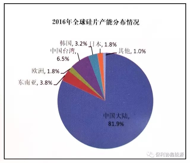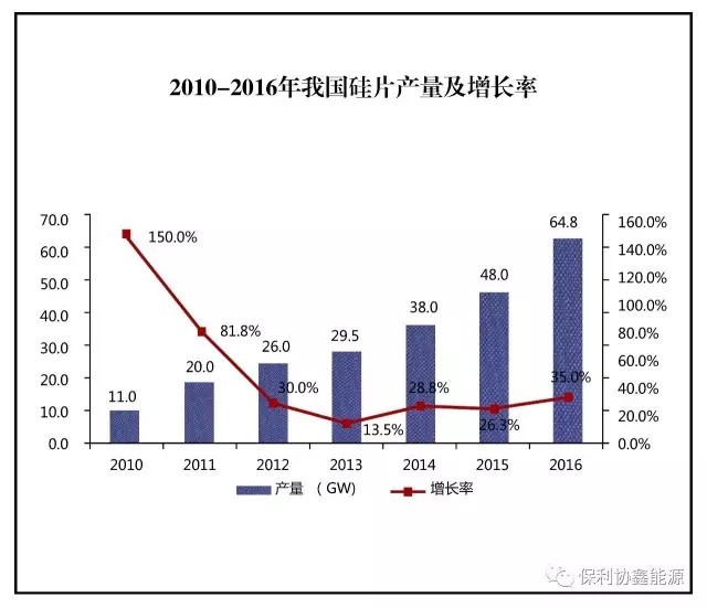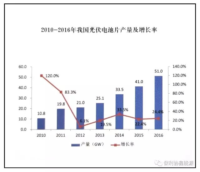 截至2016年底,中國(guó)大陸電池片總產(chǎn)能約為63GW,同比增長(zhǎng)18.9%;產(chǎn)量約為51GW,同比增長(zhǎng)24.4%,為全年全球產(chǎn)量的68%。