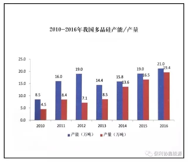 2016年,我國(guó)多晶硅生產(chǎn)保持持續(xù)增長(zhǎng)勢(shì)頭,有效產(chǎn)能達(dá)到21萬(wàn)噸,產(chǎn)量達(dá)到19.4萬(wàn)噸,占全球總產(chǎn)量的48.5%。國(guó)內(nèi)多晶硅產(chǎn)能利用率達(dá)到92.4%,生產(chǎn)基本處于飽滿狀態(tài)。